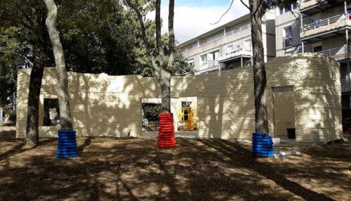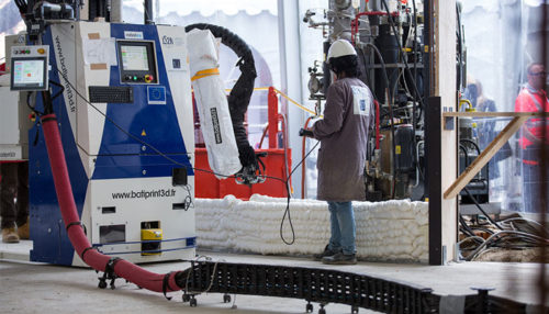 Різні учасники ринку розробили машини, які використовують різноманітні технології для 3D-друку бетону. Французька компанія Constructions-3D створила полярний 3D-принтер , який друкує всередині будівельного майданчика, а потім йде через вхідні двері будівлі після завершення будівництва. Він складається з механічної основи та роботизованої руки з насадкою для видавлювання матеріалу на кінці. Ця рука пропонує для друку площу понад 250 м² та понад 8 метрів у висоту.