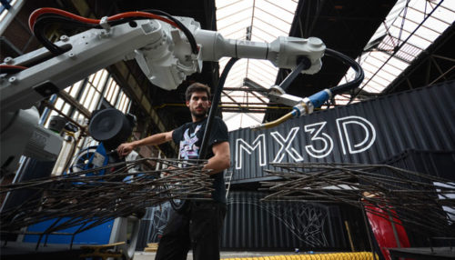 Голландська компанія MX3D розробила унікальний метод будівництва під назвою WAAM (Wire Arc Additive Manufacturing), який дозволяє 3D-друкувати металеві конструкції за допомогою 6-осьового робота, який виробляє 2 кг матеріалу на годину.