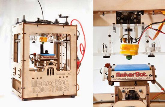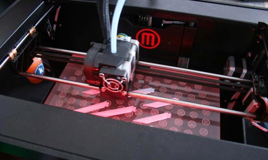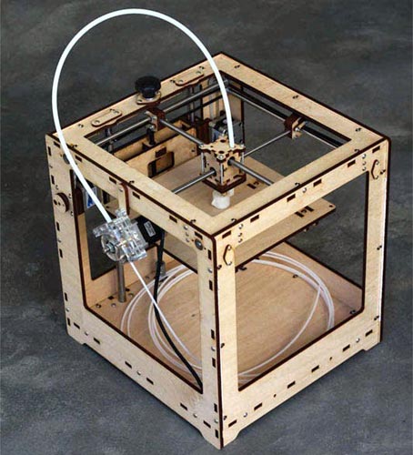 На фото одна з перших моделей компанії Makerbot. У цьому 3D принтері стіл рухається осі X і Y, а екструдер тільки осі Z.