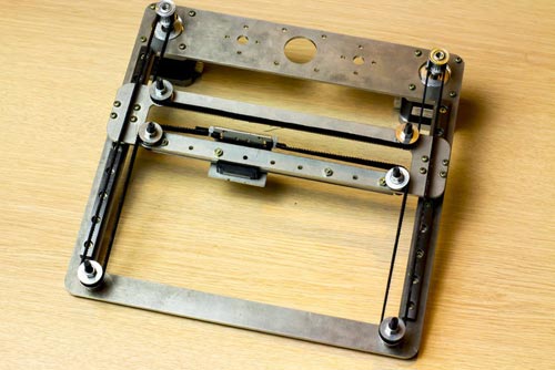 За допомогою двох зубчастих ременів двигун осі Y переміщає каретку осі X, на якій закріплений двигун, який приводить в дію друкувальну головку. Все як добре, але при цьому завжди потрібно “катати” туди-сюди двигун осі Х, а це зайва вага …. Та й треба завжди стежити за якістю натягу ременів. Усі три окремі ремені обов’язково мають бути натягнуті струною. Інакше якісного друку Вам не видно.