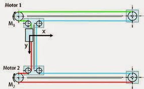 При обертанні обох двигунів в один і той же бік, виконується рух екструдера по осі X. Під час обертання обох двигунів у протилежний бік – рухається каретка з екструдером по осі Y. У разі, якщо буде обертатися лише один з двигунів – отримаємо одночасний рух по двом осям, тобто це буде рух по діагоналі.