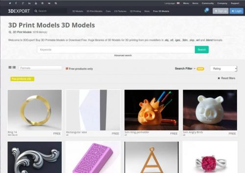 - 3DExport (Преміум 3D моделі, CG текстури і моделі для 3D друку | 3DExport): Ориентирован на профессиональных дизайнеров и 3D-художников, 3DExport – это торговая площадка для 3D-моделей премиум-класса, которые можно как купить, так и продать. Но вы можете также фильтровать поиск, для того, чтобы найти небольшую коллекцию бесплатных STL файлы для 3D-печати, с акцентом на ювелирные изделия и украшения.