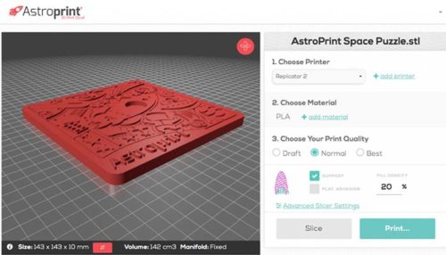 Astroprint – це хмарна платформа, побудована за тією самою концепцією, що і 3DPrinterOS та OctoPrint. Платформа включає слайсер, але також дозволяє вам контролювати і координувати ваш 3D-принтер з будь-якого пристрою, що має доступ до Інтернету – його використовують понад 85 тисяч осіб у більш ніж 130 країнах. Сам 3D-слайсер дуже простий, тому що у вас є два режими. У простому режимі ви можете вибрати тільки матеріал та бажану якість перед відправкою на 3D-принтер . У розширеному режимі ви можете налаштувати параметри для досягнення найкращих результатів. Нещодавно AstroPrint оголосив, що користувачі можуть вибрати механізм нарізки Cura як базовий слайсер для всіх своїх відбитків!