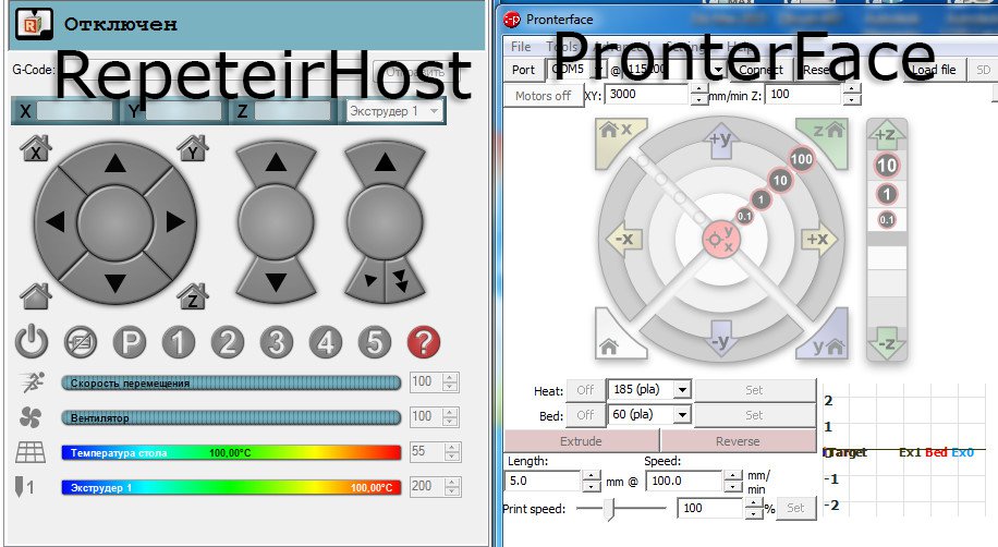 За допомогою програм PronterFace та RepetierHost здійснюється безпосередньо контроль за 3д печаткою, а саме: нагрівання екструдера, ліжка, обдування, рух по осях.