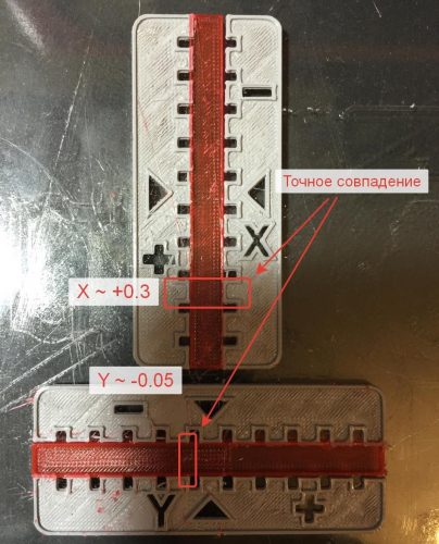При необхідності точного калібрування інтервалу між соплами двох екструдерів, що застосовуються при друку, цей процес можна зробити вручну, вимірявши на спеціальній калібрувальної моделі осьове зміщення. За такого калібрування перше сопло вважається базовим і його позначку прийнято вважати нульовим. Нам відомо, що  3D -принтери PRIME 2X мають зміщення Y приблизно 32,15 мм. Залежно від напрямку відліку, тобто того, який екструдер вважається першим, другий екструдер отримає усунення з позитивним чи негативним знаком.