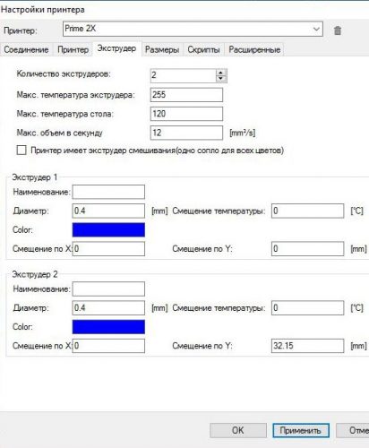 3. У меню налаштувань слайсера може бути задано різну відстань між соплами. Для 3д принтера Prime 2X базова відстань між осями сопел, або як його ще називають зміщення по осі Y, дорівнює 32,15 мм. Точна відстань вимірюється в процесі калібрування пристрою, а крім того, велику роль відіграє тип сопла.