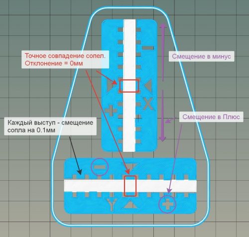 Для того, щоб здійснити максимально точне калібрування сопел необхідно використовувати тестовий режим друку. За великим рахунком, для цих цілей можна використовувати два різні файли, зробивши після друку виміри зміщення і порівнюючи його із заданим при налаштуванні, але ідеальним варіантом буде застосування спеціально розробленої для цих цілей калібрувальної моделі.